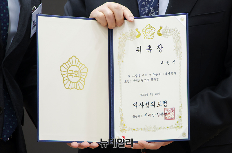 우원식 국회의장이 28일 오전 서울 여의도 국회 의원회관에서 열린 역사정의포럼 창립대회 및 세미나에서 위촉장을 받고 기념촬영을 하고 있다.