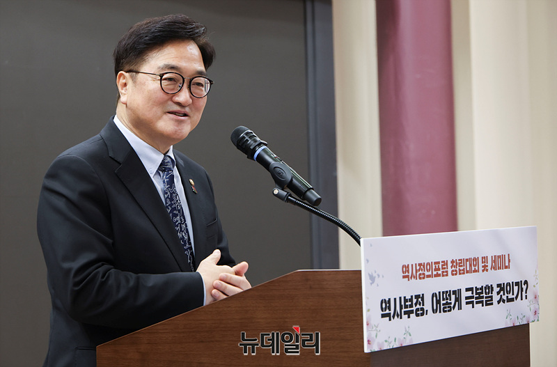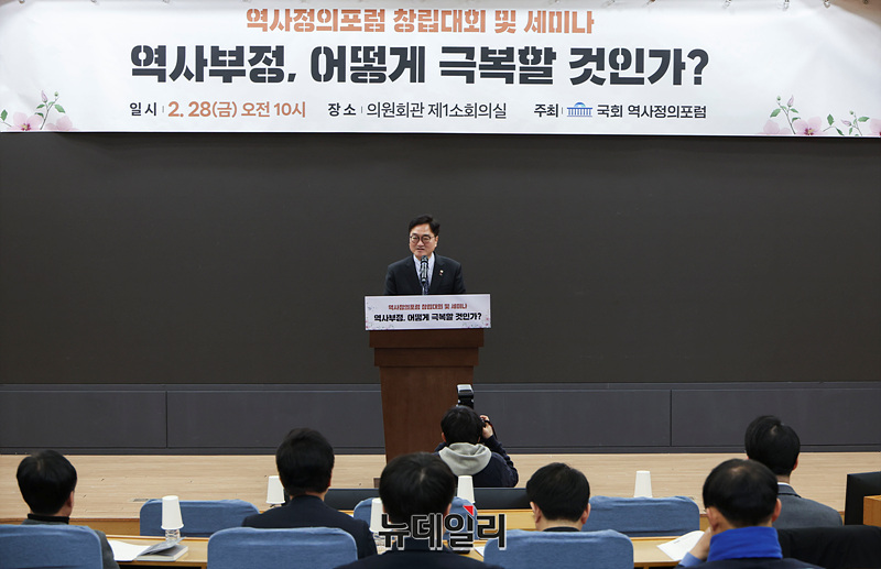 우원식 국회의장이 28일 오전 서울 여의도 국회 의원회관에서 열린 역사정의포럼 창립대회 및 세미나에서 인사말을 하고 있다.