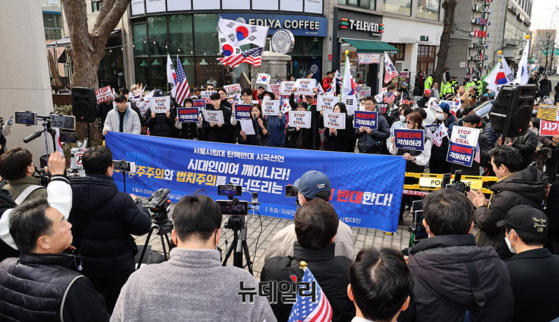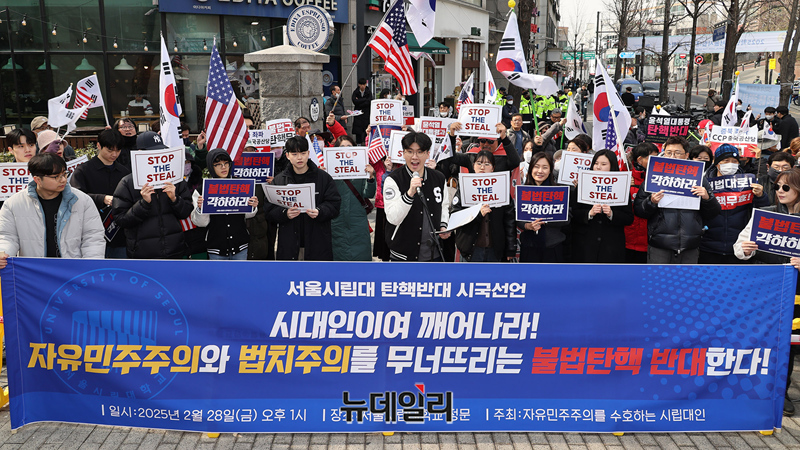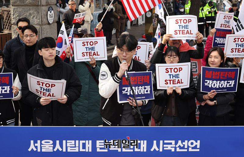 서울시립대 재학생과 졸업생으로 구성된 자유민주주의를 수호하는 시립대인이 28일 오후 서울 동대문구 서울시립대 정문에서 윤석열 대통령 탄핵을 반대하는 시국선언을 하고 있다. 앞서 이날 오전 성균관대도 탄핵반대 시국선언에 동참했다.