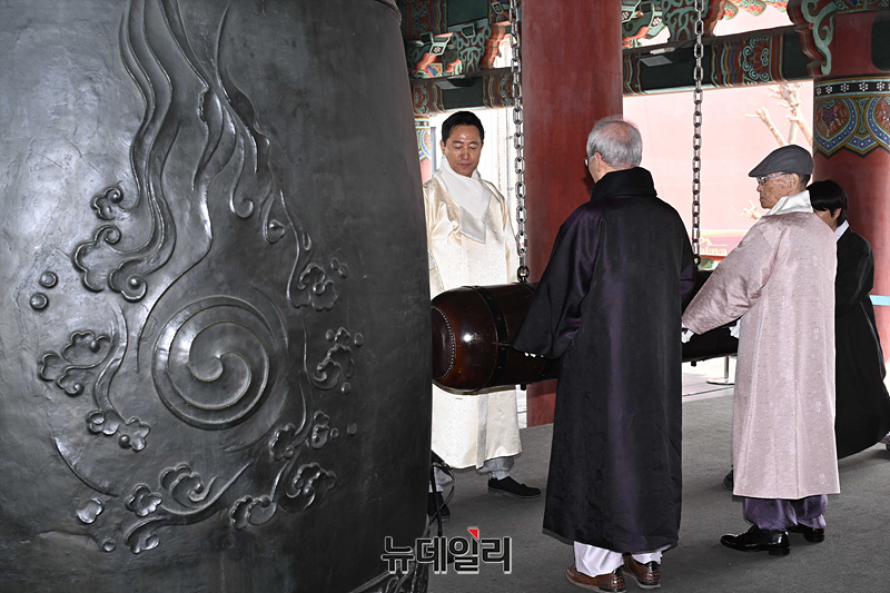 오세훈 서울시장과 독립유공자 후손을 비롯한 참석자들이 1일 서울 종로구 보신각에서 열린 제106주년 3·1절 기념 타종행사에서 타종을 하고 있다. (사진=공동취재단)