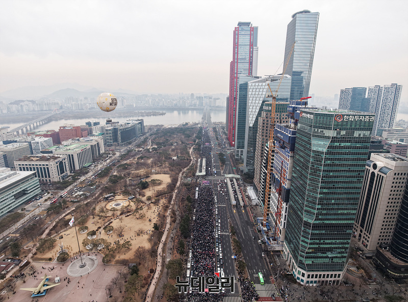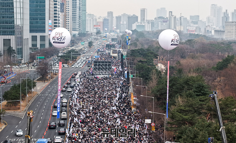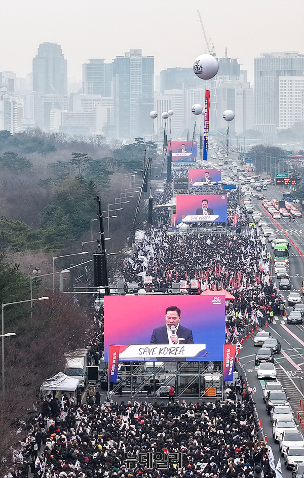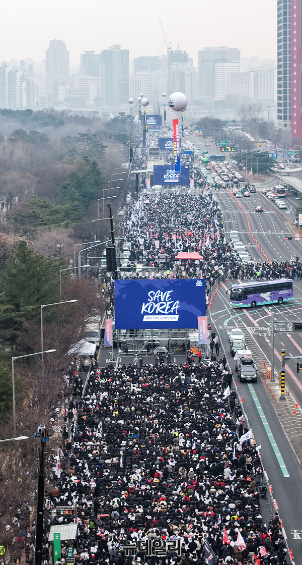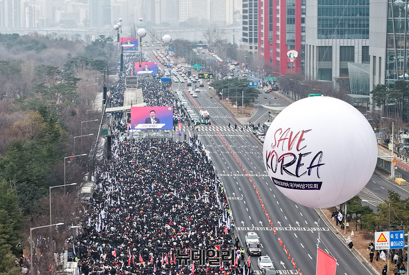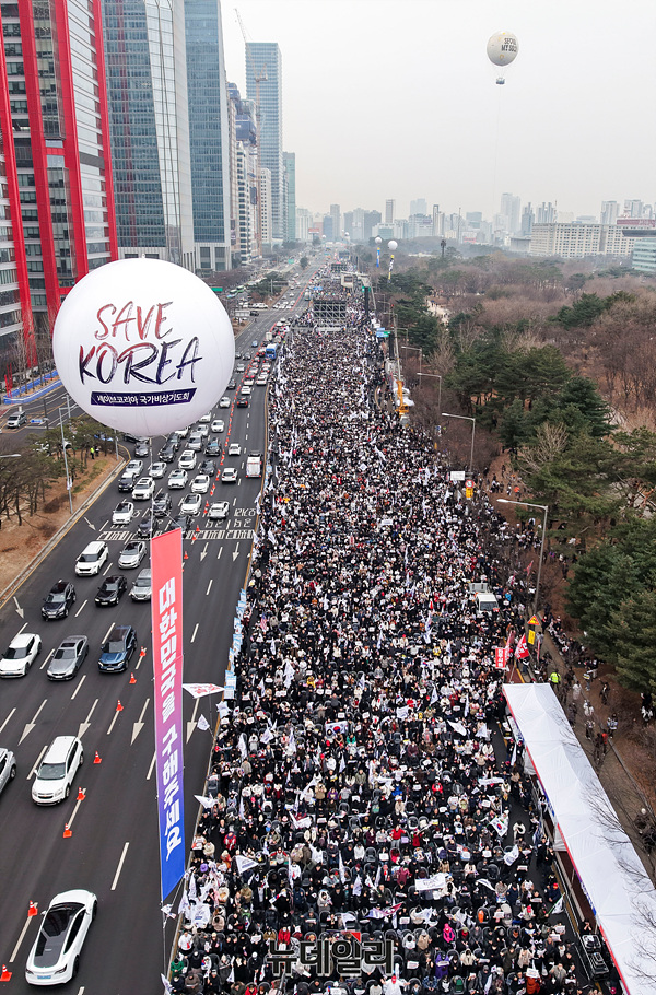윤석열 대통령 탄핵을 반대하는 세이브코리아 국가비상기도회가 1일 오후 서울 여의도 여의대로에서 진행되고 있다.