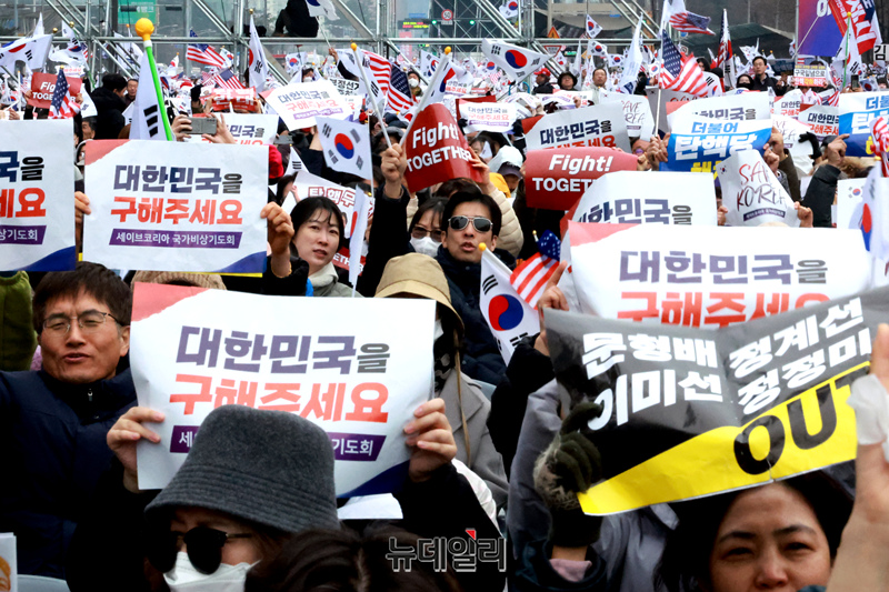 '세이브코리아 3·1절 국가비상기도회'가 1일 오후 서울 영등포구 여의도 여의대로에서 열린 가운데 참석자들이 윤석열 대통령 탄핵 기각을 촉구하고 있다.