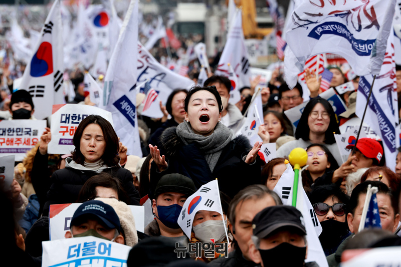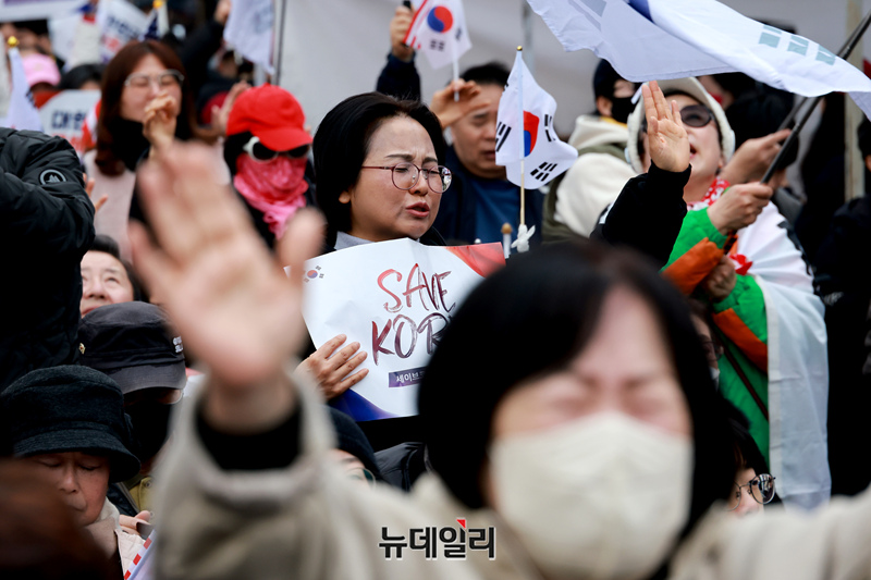 '세이브코리아 3·1절 국가비상기도회'가 1일 오후 서울 영등포구 여의도 여의대로에서 열린 가운데 참석자들이 윤석열 대통령 탄핵 기각을 촉구하고 있다.
