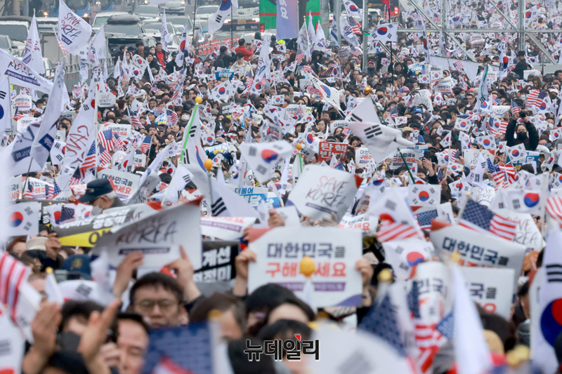 '세이브코리아 3·1절 국가비상기도회'가 1일 오후 서울 영등포구 여의도 여의대로에서 열린 가운데 참석자들이 윤석열 대통령 탄핵 기각을 촉구하고 있다.