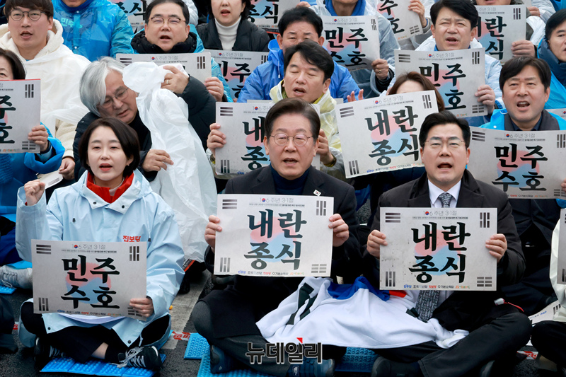 이재명 더불어민주당 대표 및 야5당 대표들이 1일 오후 서울 종로구 안국동 사거리에서 열린 야5당 공동 내란종식·민주헌정수호를 위한 윤석열 파면 촉구 범국민대회에서 손팻말을 들고 구호를 외치고 있다.