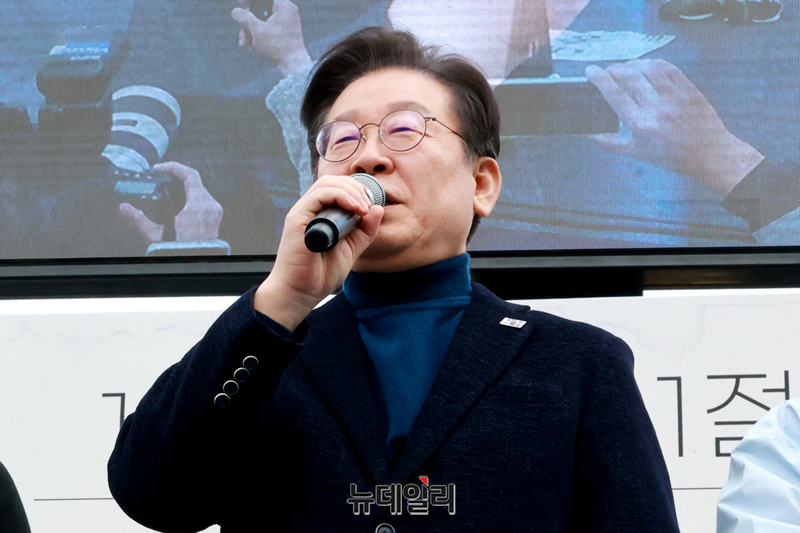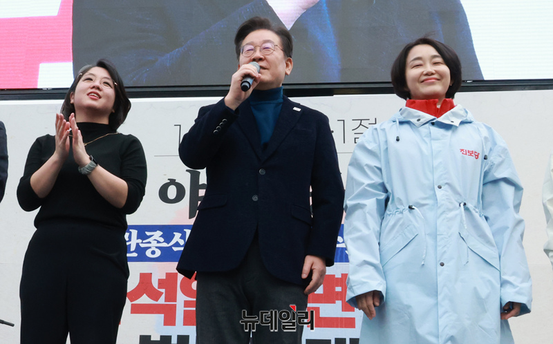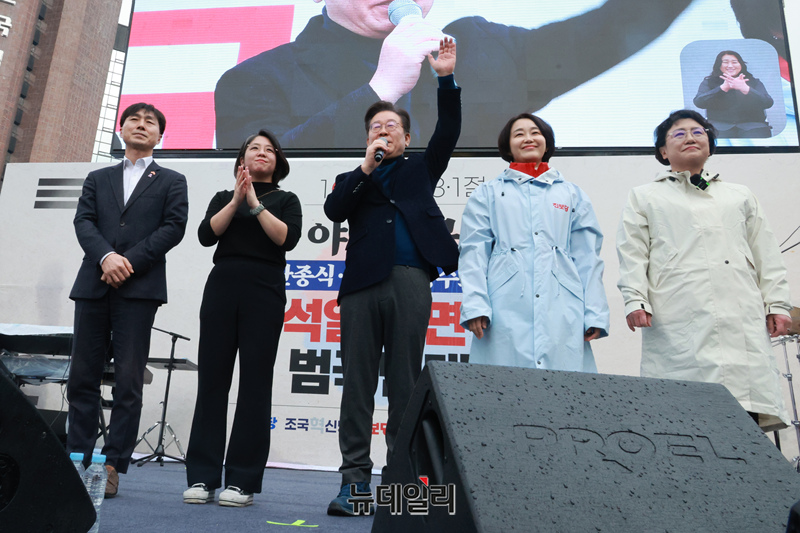 이재명 더불어민주당 대표가 1일 오후 서울 종로구 안국동 사거리에서 열린 야5당 공동 내란종식·민주헌정수호를 위한 윤석열 파면 촉구 범국민대회에서 발언을 하고 있다.