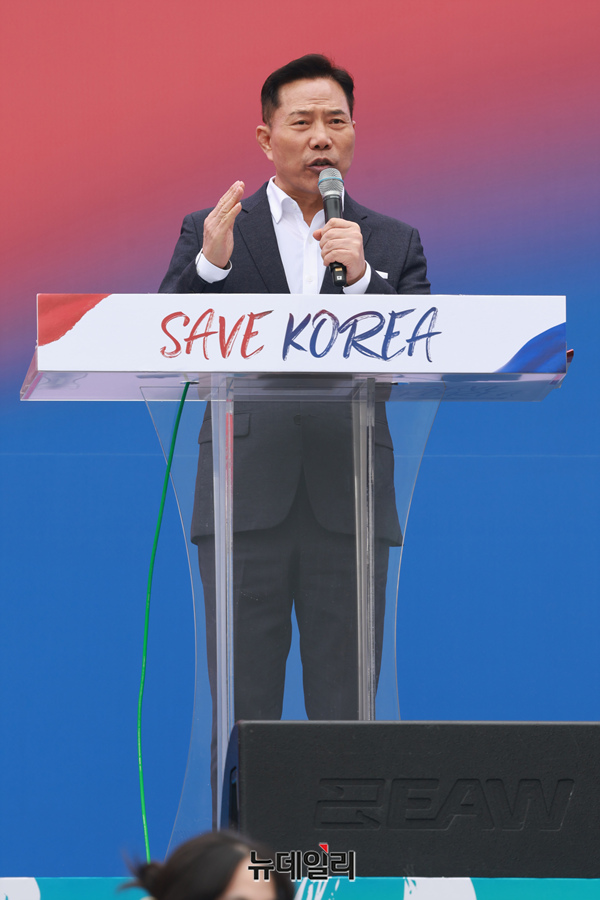 '세이브코리아 3·1절 국가비상기도회'가 1일 오후 서울 영등포구 여의도 여의대로에서 열린 가운데 집회를 주도하는 손현보 세계로교회 목사가 발언을 하고 있다.