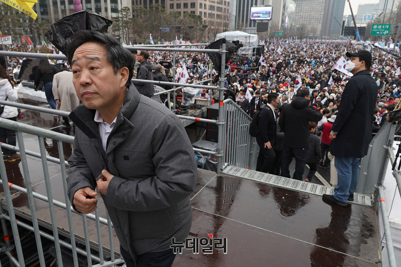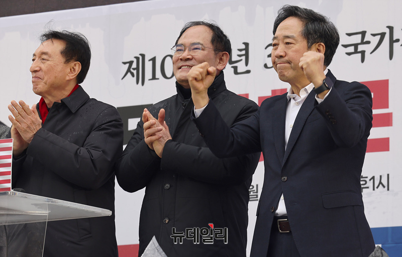 강승규(오른쪽), 임종득, 김석기 국민의힘 의원이 삼일절인 1일 오후 서울 광화문 일대에서 대한민국바로세우기운동본부(대국본)가 주최하는 삼일절 천만광화문국민대회에 참석해 자리하고 있다.