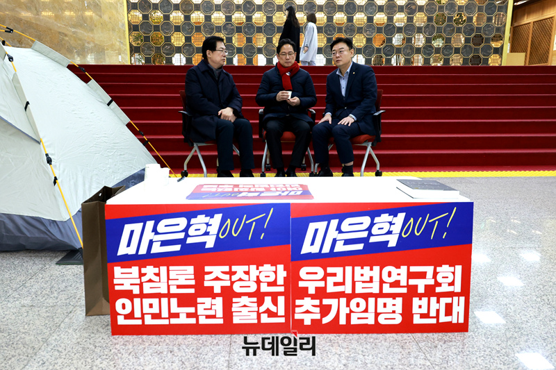 이만희·김성원 국민의힘 의원이 4일 국회 로텐더홀에서 마은혁 헌법재판관 임명에 반대하는 단식농성을 하고 있는 박수영 의원을 찾아 대화하고 있다.