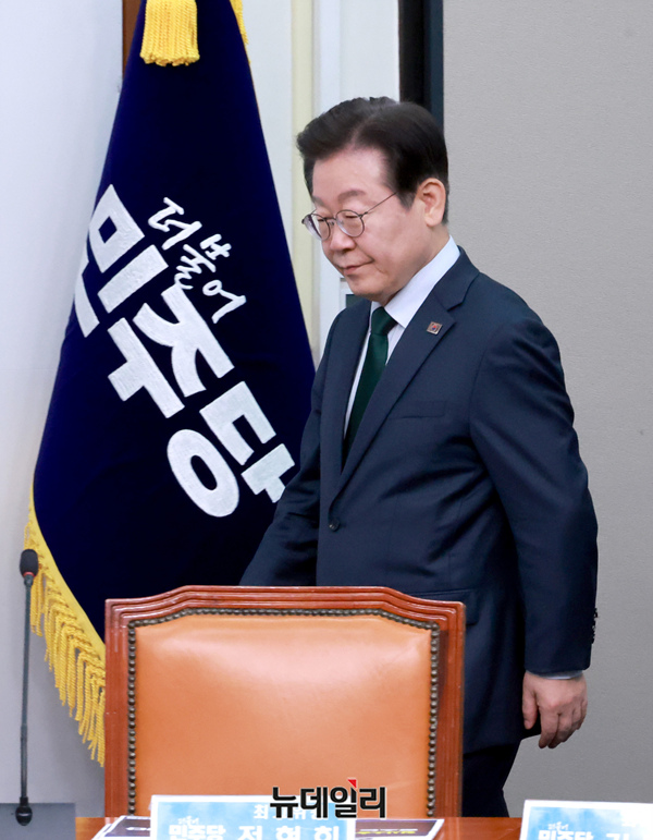 이재명 더불어민주당 대표가 5일 오전 국회에서 열린 최고위원회의에 참석하기 위해 입장하고 있다.