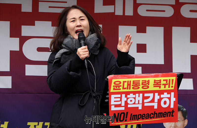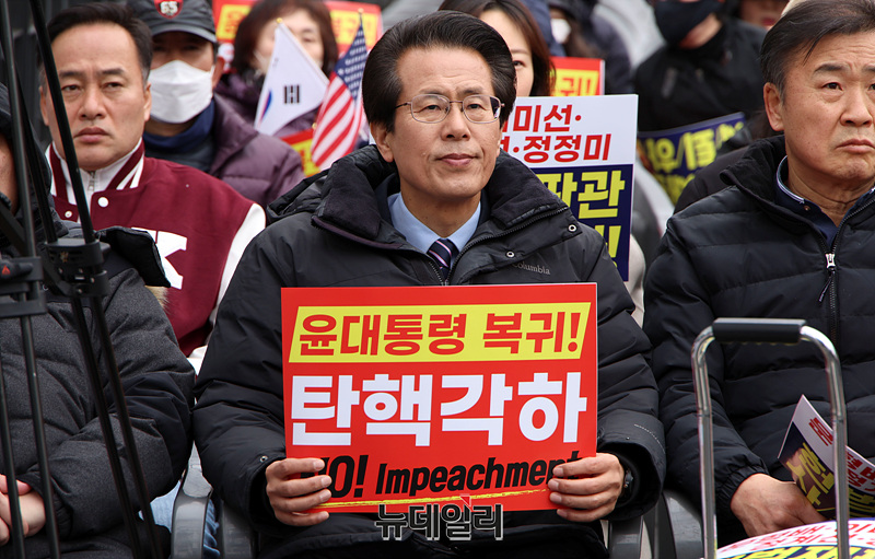 윤석열 대통령 탄핵을 반대하는 세이브코리아와 탄핵반대범국민연합이 5일 오전 서울 종로구 현대건설 앞에서 탄핵 각하 촉구 집회를 진행하고 있다.