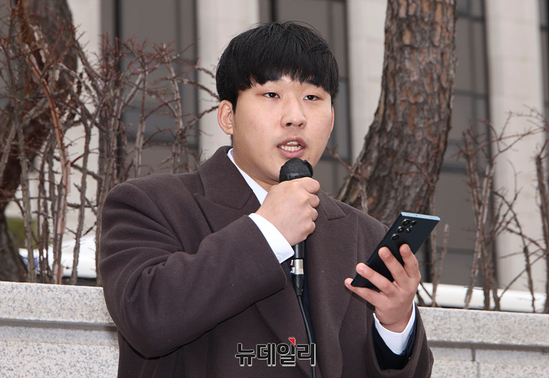 탄핵기각 촉구 무제한 필리버스터 기자회견이 이틀째 진행중인 5일 오전 헌법재판소 앞에서 한 청년이 발언하고 있다.