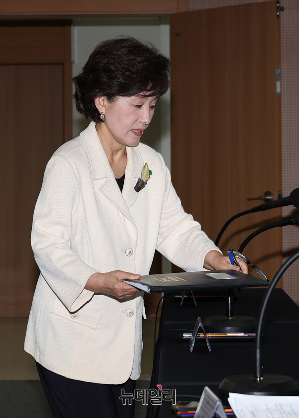 박선영 진실화해위원회 위원장이 5일 오전 서울 중구 진실화해위원회 대회의실에서 열린 제100차 위원회 기념 기자간담회에 입장해 인사를 나누고 있다.