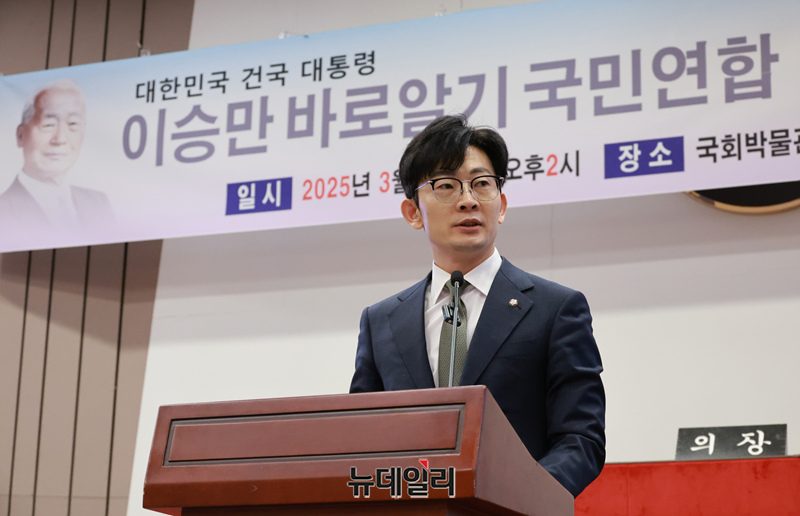 이승만 바로알기 국민연합(대표 변정일) 출범식 및 기념 강연이 5일 오후 국회 박물관에서 열린 가운데 박충권 국민의힘 의원이 축사를 하고 있다.이날 행사는 이승만동상광화문건립추진위원회와자유헌정포럼, 한반도미래재단, 한반도인권과통일을위한변호사 모임 등 20여 개 단체가 참여 했다.기념 강연회에서는 이영훈 이승만 학당 교장이 '제헌헌법 전문에 새겨진 대한민국 건국의 정통성', 류석춘 전 연세대 교수가 '이승만은 과연 친일인가?', 인보길 뉴데일리 미디어그룹 회장이 '이승만은 독재자인가?', 정안기 박사가 '이승만은 남북문단 책임자인가?' 등의 주제 발표를 이어갔다.