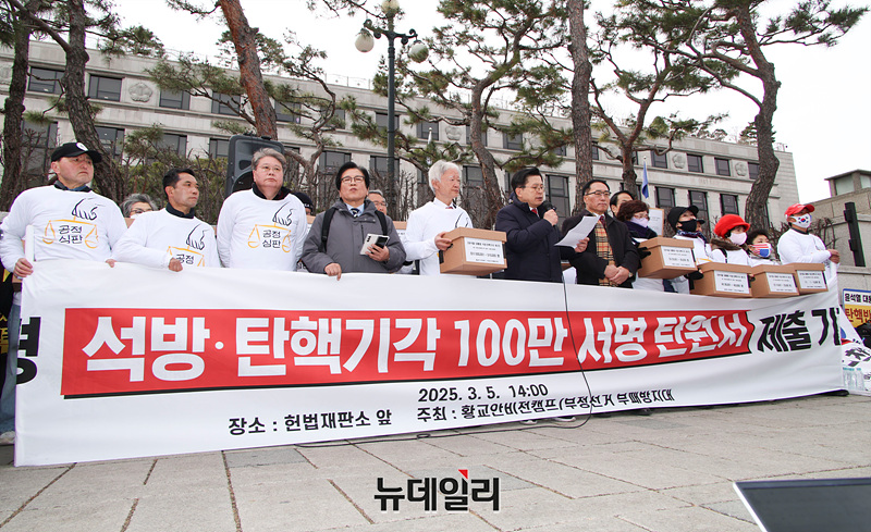 황교안 전 국무총리가 이끄는 부정선거부패방지대(부방대)가 5일 오후 서울 종로구 헌법재판소 앞에서 전화 서명을 통해 받은 '윤석열 대통령 석방·탄핵 기각 요구 청원' 105만여 건 제출에 앞서 기자화견을 하고 있다.