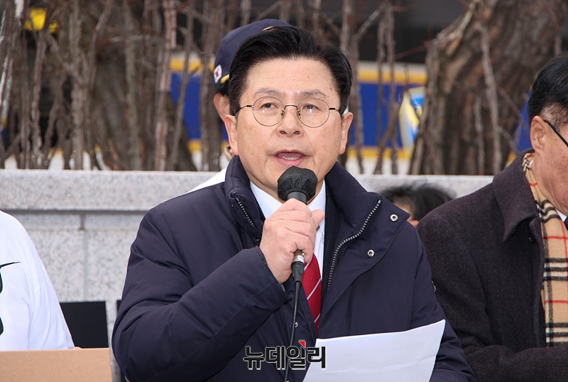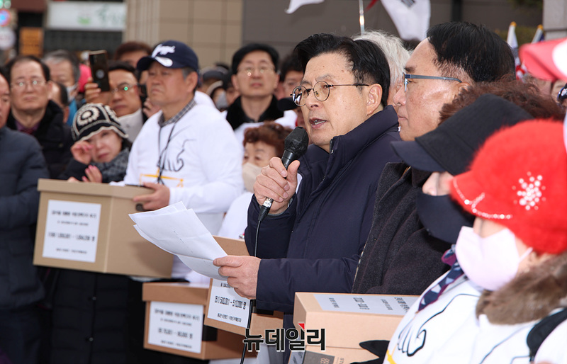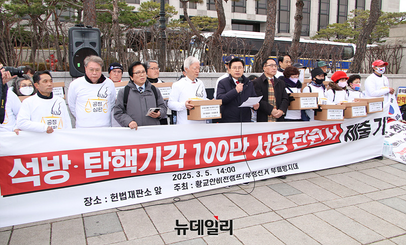 황교안 전 국무총리가 5일 오후 서울 종로구 헌법재판소 앞에서 전화 서명을 통해 받은 '윤석열 대통령 석방·탄핵 기각 요구 청원' 105만여 건 제출에 앞서 기자화견을 하고 있다.