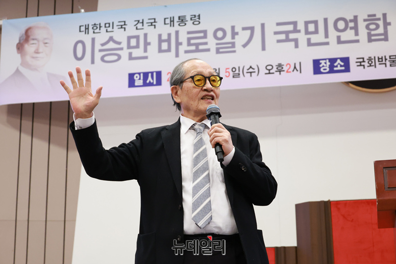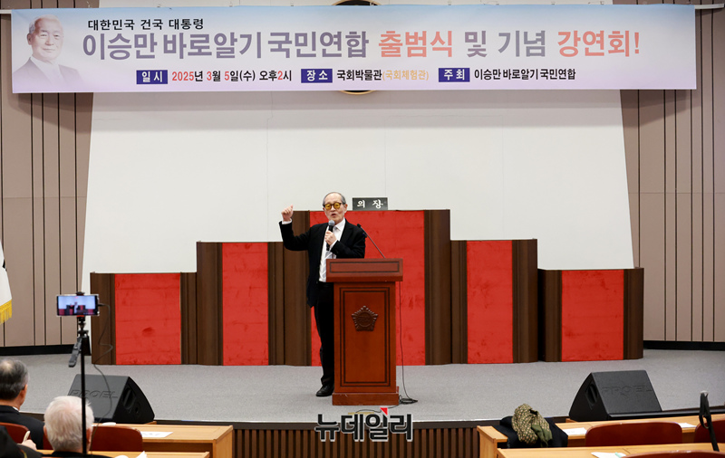 인보길 뉴데일리 미디어그룹 회장이 5일 오후 국회 박물관에서 열린 이승만바로알기국민연합 출범식 및 기념 강연에서 '이승만은 독재자인가?'를 주제로 강연을 하고 있다.