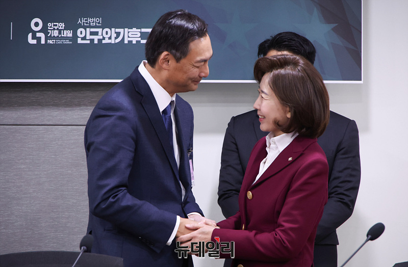 나경원 국민의힘 의원이 6일 오전 서울 여의도 국회 의원회관에서 열린 '대한민국 자유민주주의·법치주의 위기와 한미 자유동맹의 길 : 모스 탄 전 미국 국제형사사법 대사 초청 세미나'에서 모스 탄 전 대사와 인사를 나누고 있다.