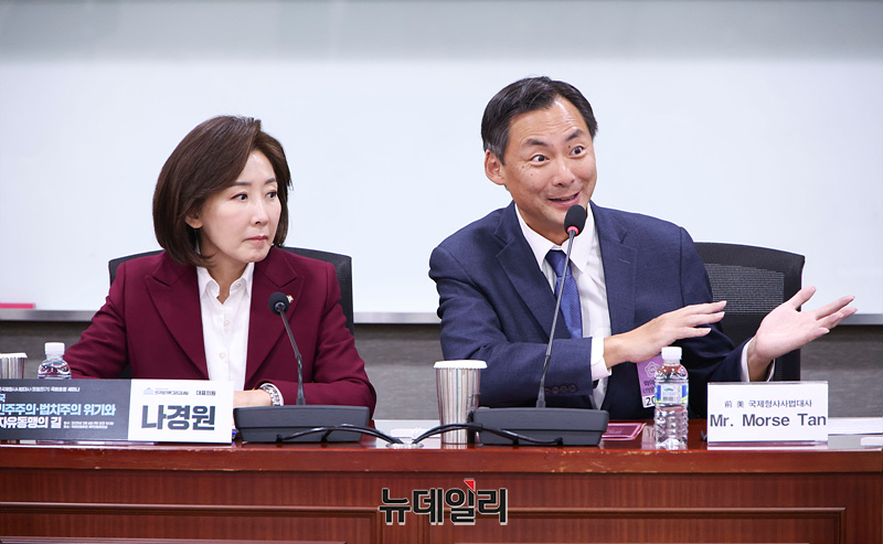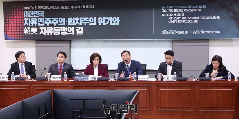 모스 탄 전 미국 국제형사사법 대사가 6일 오전 서울 여의도 국회 의원회관에서 열린 대한민국 자유민주주의·법치주의 위기와 한미 자유동맹의 길 세미나에서 연설하고 있다.