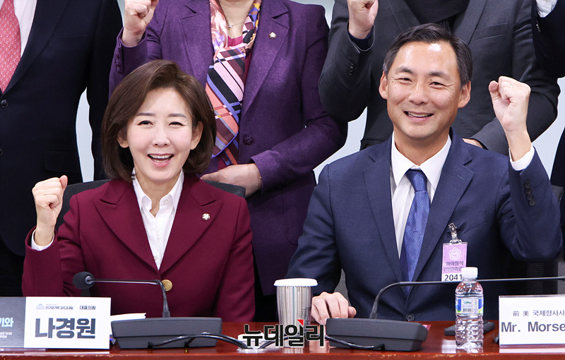 나경원 국민의힘 의원과 모스 탄 전 미국 국제형사사법 대사를 비롯한 참석자들이 6일 오전 서울 여의도 국회 의원회관에서 열린 대한민국 자유민주주의·법치주의 위기와 한미 자유동맹의 길 세미나에서 기념촬영을 하고 있다.