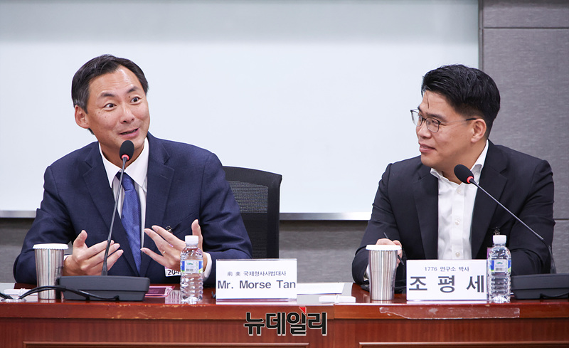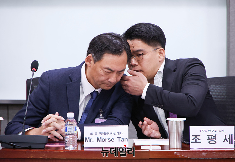 조평세 박사가 6일 오전 서울 여의도 국회 의원회관에서 열린 대한민국 자유민주주의·법치주의 위기와 한미 자유동맹의 길 세미나에서 모스 탄 전 미국 국제형사사법 대사의 연설을 통역하고 있다.