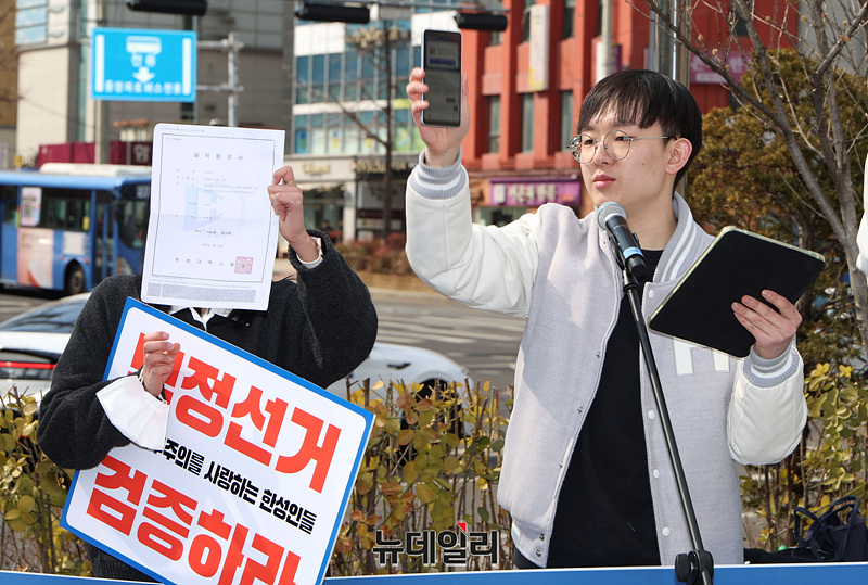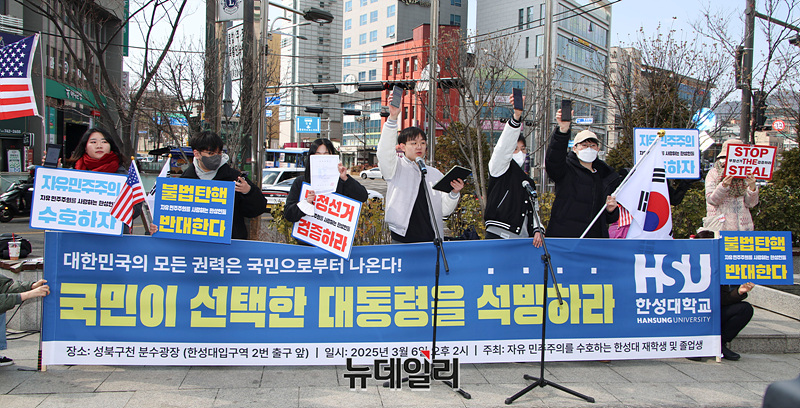자유 민주주의를 수호하는 한성대 재학생 및 졸업생이 6일 오후 서울 성북구 한성대입구역 앞에서 열린 탄핵반대 시국선언에 앞서 학생증과 재학증명서를 들어 보이고 있다.