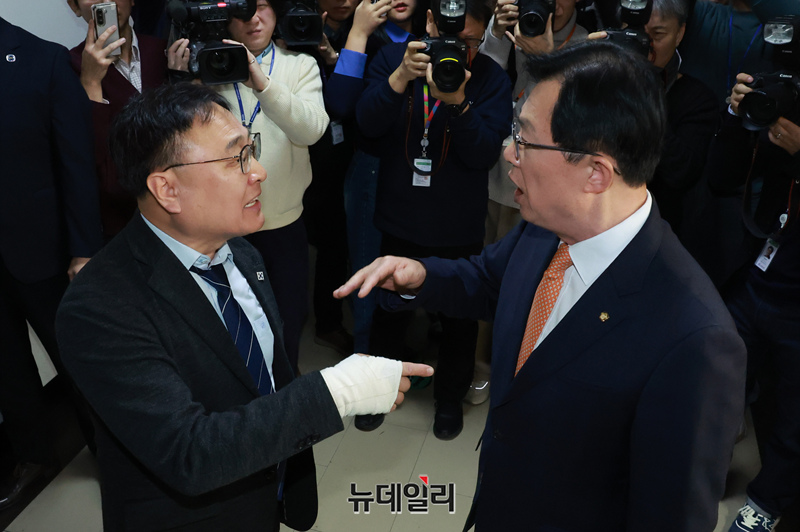 이만희 국민의힘 의원과 이광희 더불어민주당 의원이 6일 오전 국회 행정안전위원회에서 열린 김대웅 중앙선거관리위원회 위원 후보자 인사청문회가 정회된 후 설전을 벌이고 있다.