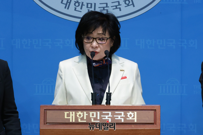 허명 한국여성단체협의회장과 회원들이 6일 오전 국회 소통관에서 기자회견을 갖고 더불어민주당 김준혁 국회의원의 김활란 한국여성단체협의회 초대 회장에 대한 명예훼손 발언과 관련한 입장을 발표하고 있다.이날 허 회장은 "김준혁 의원이 근거로 제시한 논문과 미군 방첩부대(CIC) 보고서 어디에도 김활란 박사가 이화여대생을 미군에게 성 상납했다는 내용은 나오지 않는다. 영문 보고서 원문에 나오는 'hostess'는 여성 주최자를 의미하는 것인데, 통속적 의미의 '호스티스'로 오역한 것이라며 김준혁 의원이 제시한 해명자료 어디에도 그가 주장한 내용에 대한 근거가 없다”고 밝혔다.