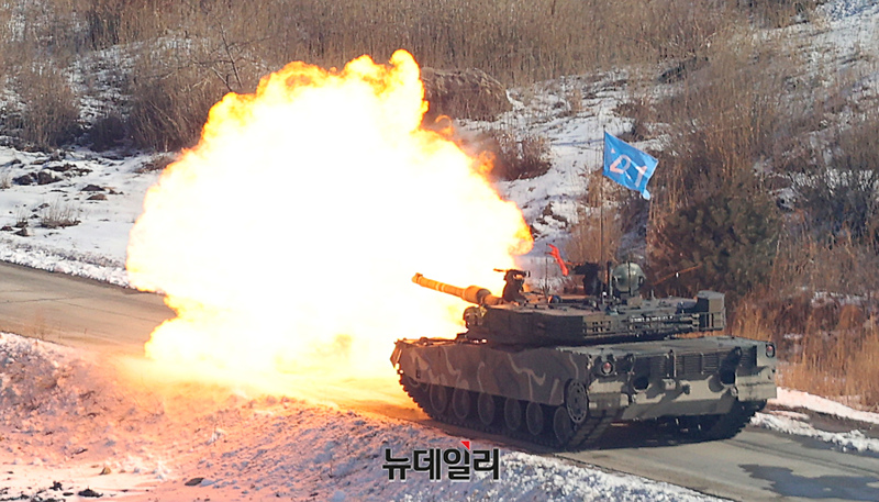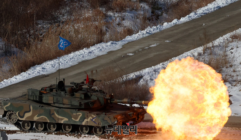 2025년 전반기 한미연합 수도기계화보병사단(수기사) 통합화력 실사격 훈련이 6일 오전 경기 포천시 승진훈련장에서 열린 가운데 K1A2 전차가 포를 쏘고 있다. (사진=공동취재단)
