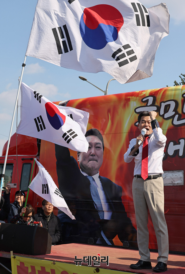 전한길 한국사 강사가 6일 오후 윤석열 대통령이 수감돼 있는 경기 의왕시 서울구치소 앞에서 '윤석열 대통령께 드리는 편지'를 낭독하고 있다.전 강사는 정문 앞에서 낭독을 진행하려 했지만 좌파단체의 대형 스피커 방해로 인근에서 진행되고 있는 탄핵반대 연단에 올라 발언을 마무리 했다. (경기 의왕=정상윤 기자)