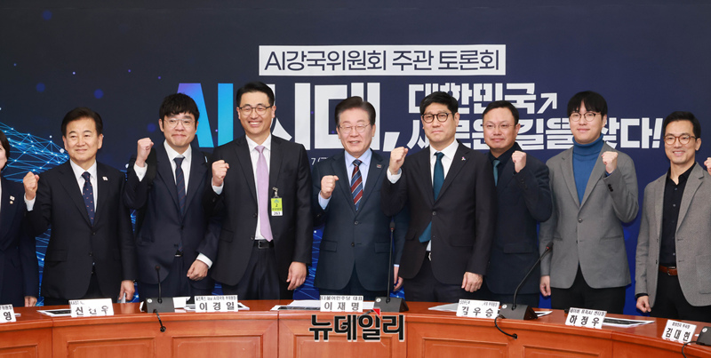 이재명 더불어민주당 대표가 7일 오전 국회에서 열린 AI강국위원회 주관 토론회 'AI 시대, 대한민국 새로운 길을 찾다'에 참석해 기념사진 촬영을 하고 있다.