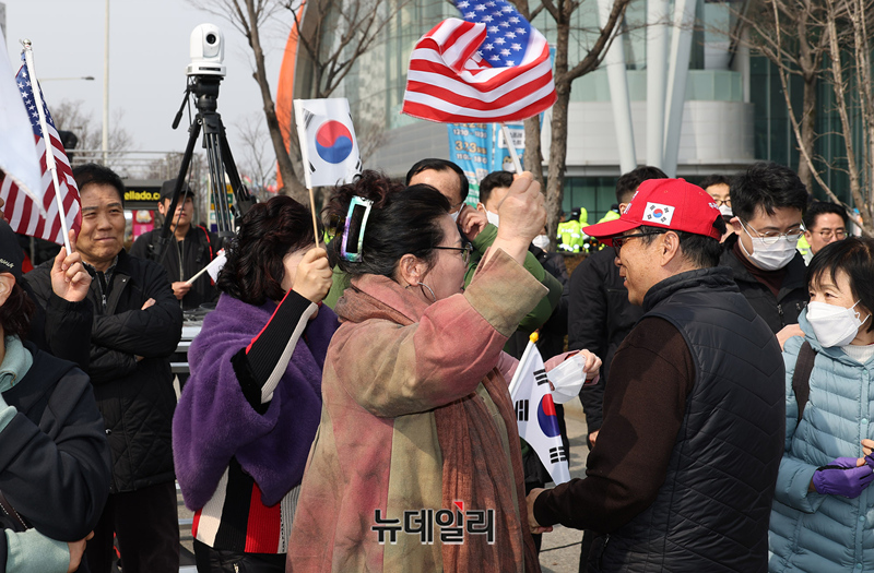 윤석열 대통령 탄핵을 반대하는 전남, 전북 호남권 대학연합이 7일 오후 광주 서구 김대중컨벤션센터 앞에서 열린 탄핵반대 시국선언에서 대통령 석방 소식에 기뻐하고 있다.