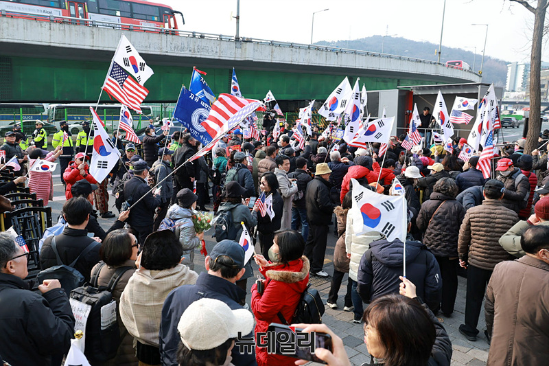 구속기소된 윤석열 대통령의 구속취소 청구가 인용된 7일 오후 서울 용산구 한남동 대통령 관저 인근에서 윤 대통령 지지자들이 구호를 외치고 있다.