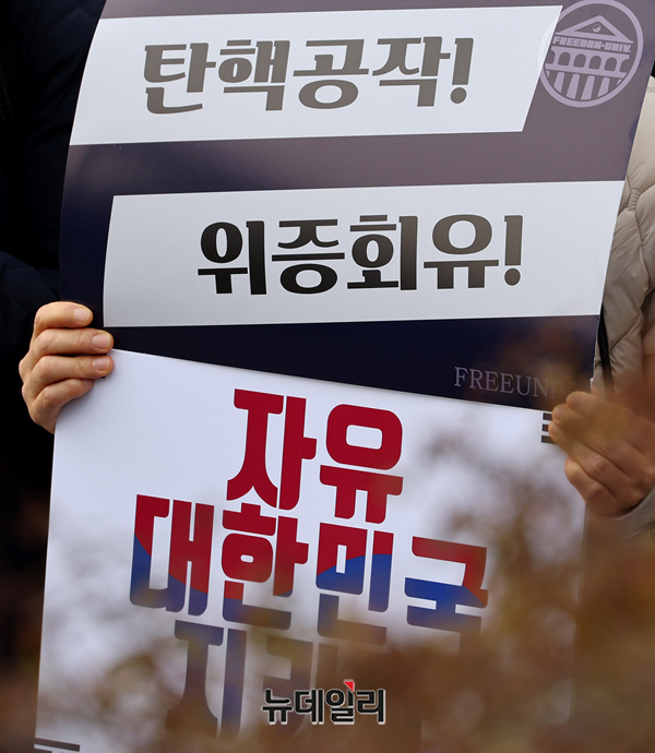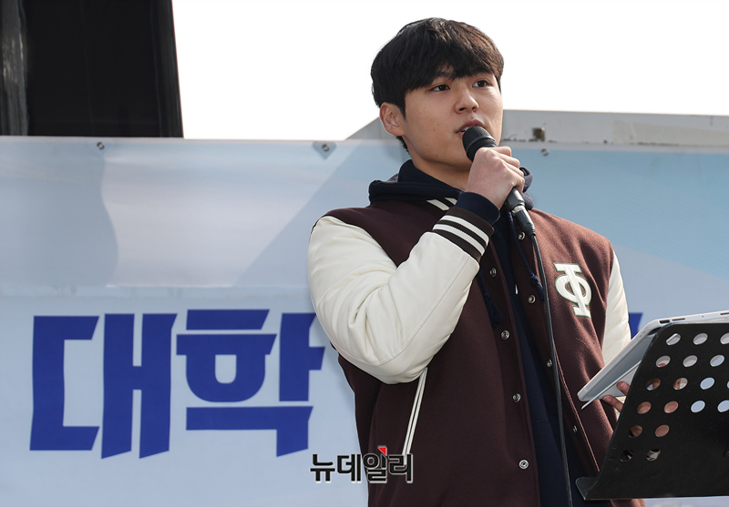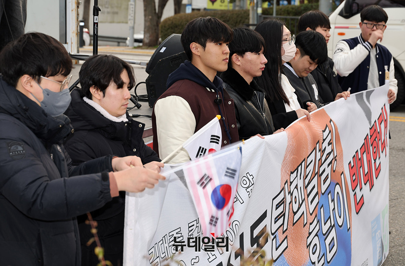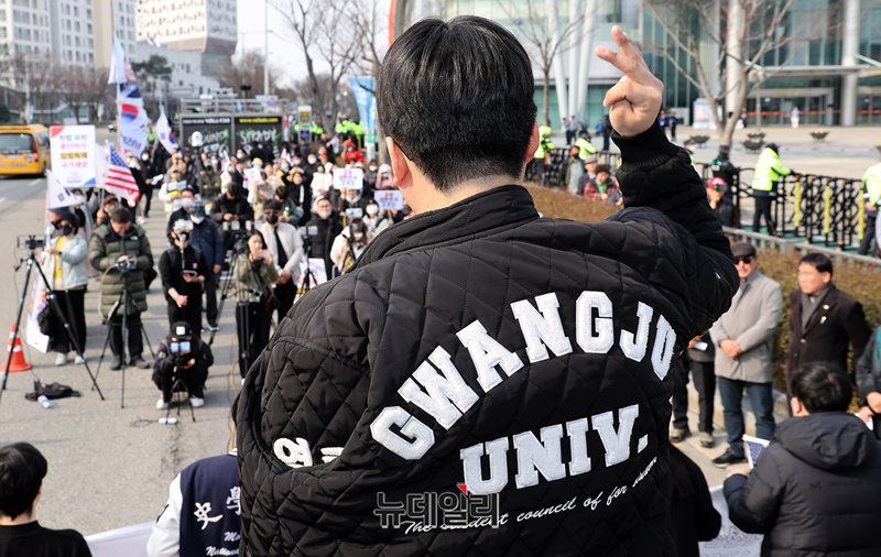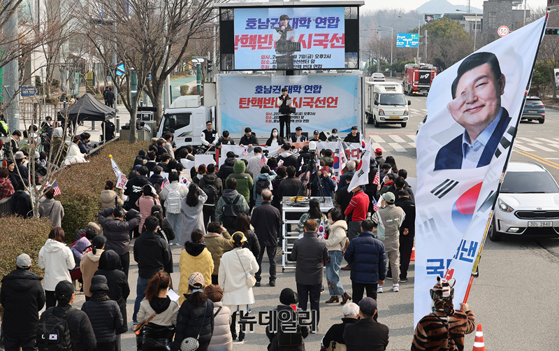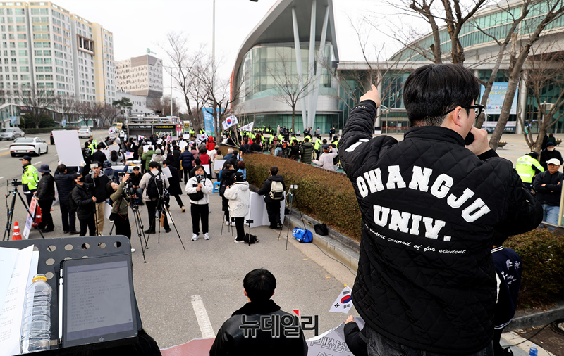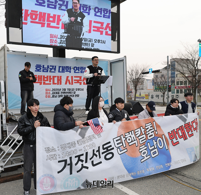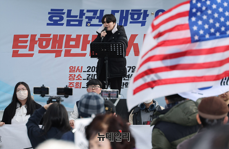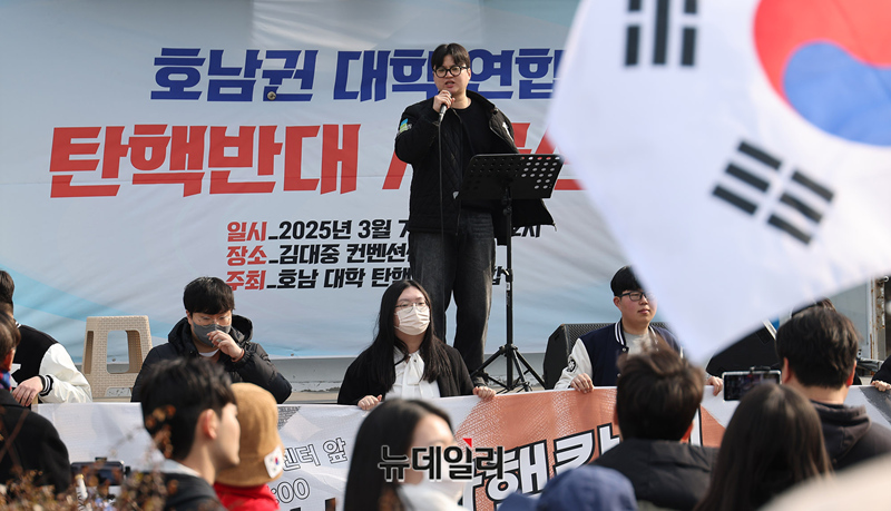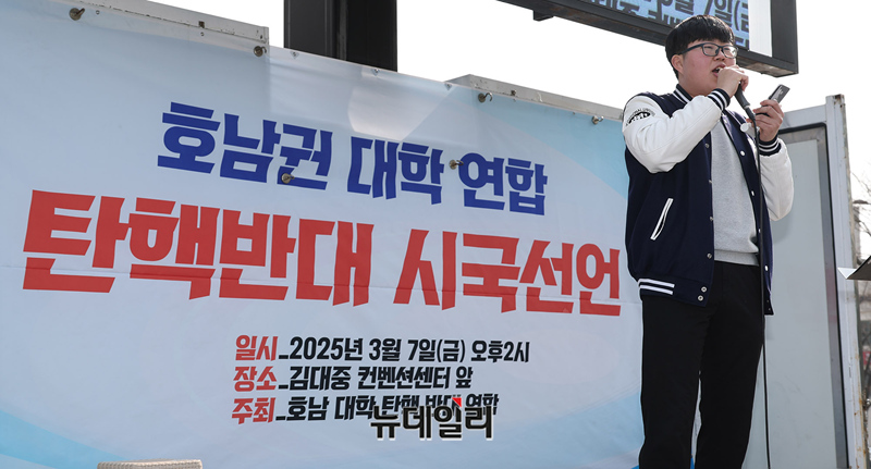 윤석열 대통령 탄핵을 반대하는 전남, 전북 호남권 대학연합이 7일 오후 광주 서구 김대중컨벤션센터 앞에서 탄핵반대 시국선언을 진행하고 있다.