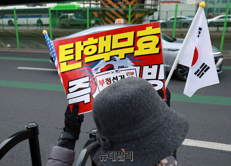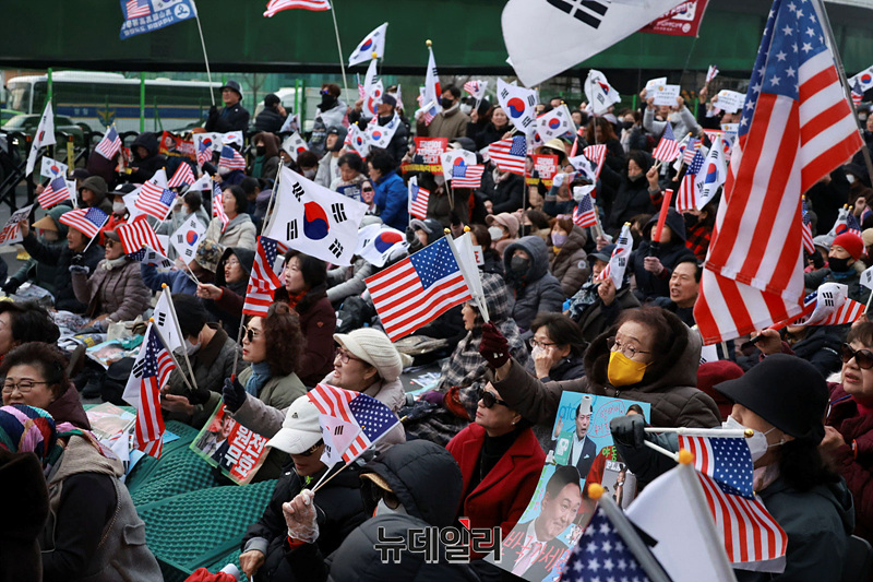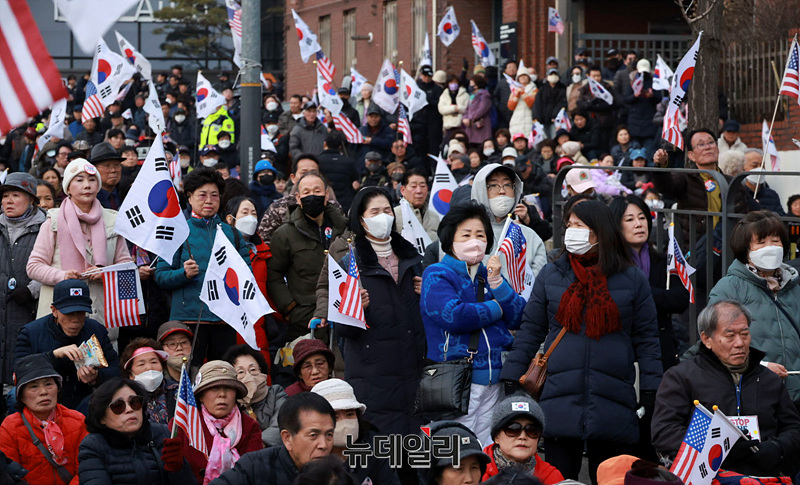 구속기소된 윤석열 대통령의 구속취소 청구가 인용된 7일 오후 서울 용산구 한남동 대통령 관저 인근에서 지지자들이 윤 대통령 석방을 촉구하고 있다.