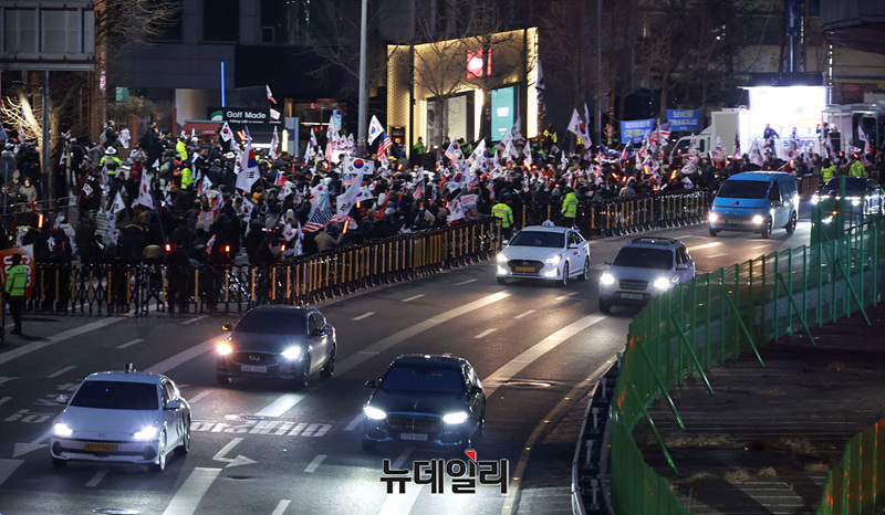 구속기소된 윤석열 대통령의 구속취소 청구가 인용된 7일 오후 서울 용산구 한남동 대통령 관저 인근에서 지지자들이 윤 대통령 석방을 촉구하고 있다.