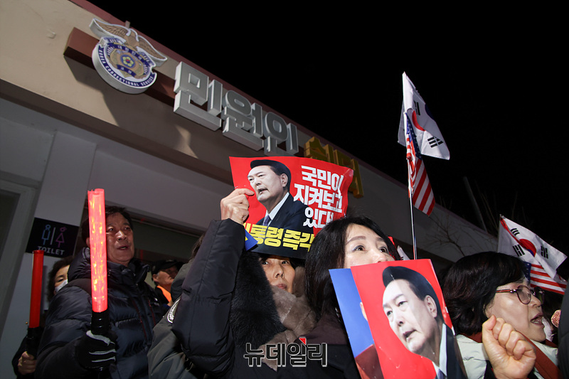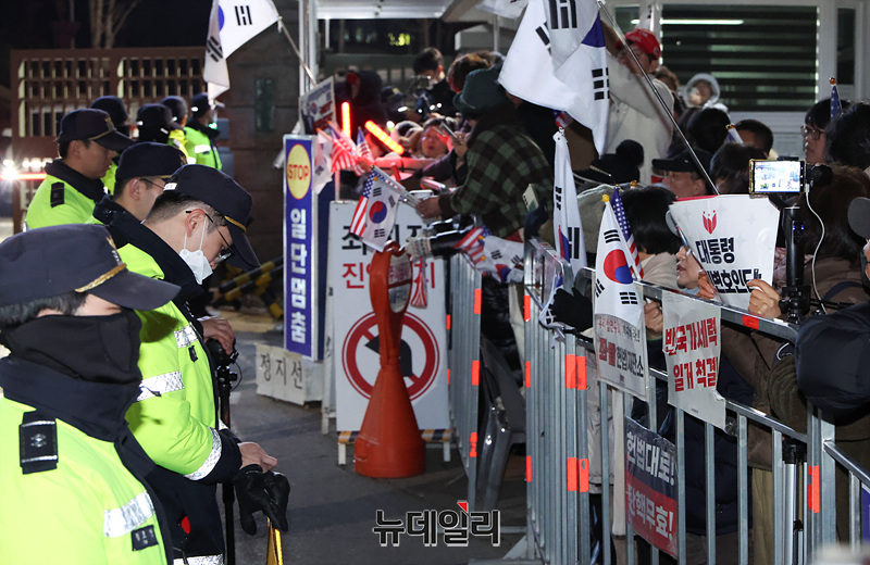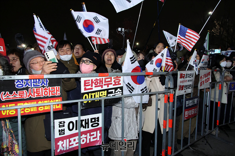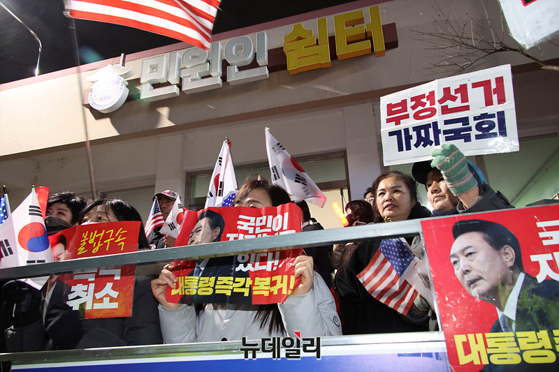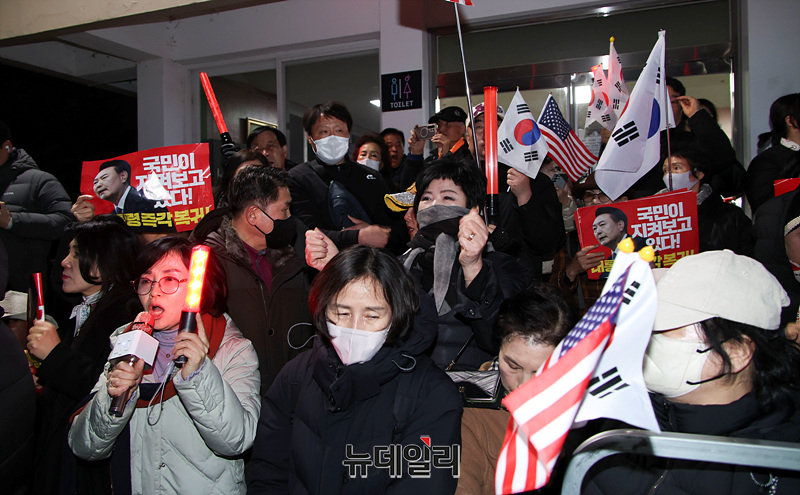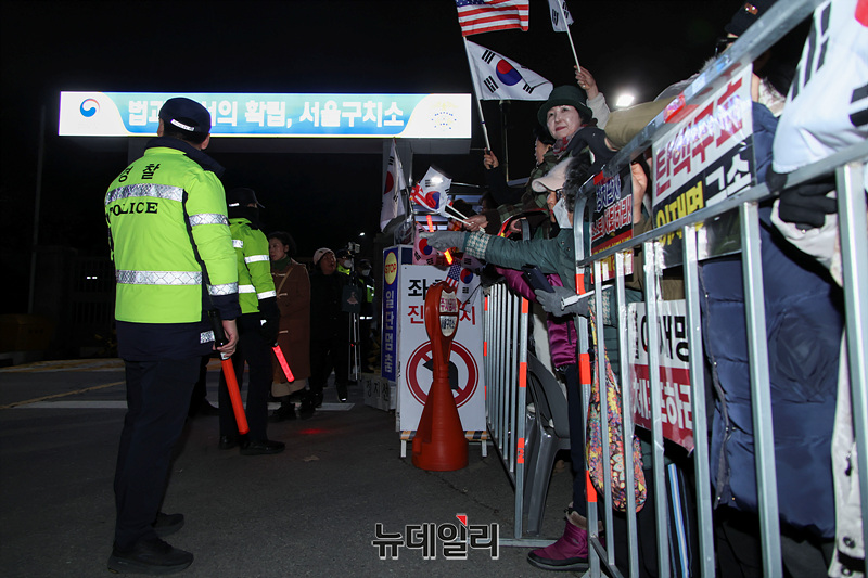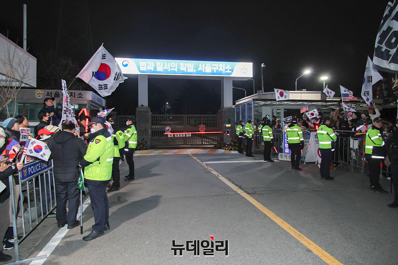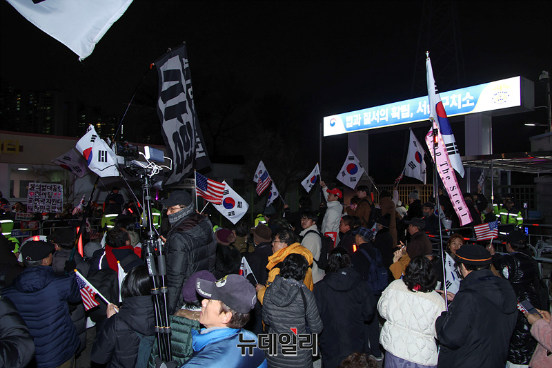 구속기소된 윤석열 대통령의 구속취소 청구가 인용된 7일 밤 윤 대통령이 수감 중인 경기 의왕시 서울구치소 앞에서 시민들이 윤 대통령 석방을 기다리며 태극기와 성조기를 들고 구호를 외치고 있다. (경기 의왕=서성진 기자)