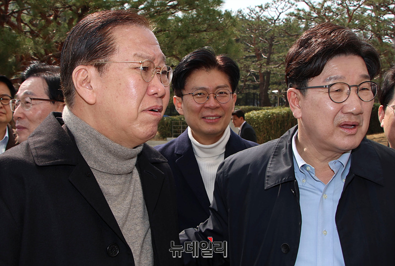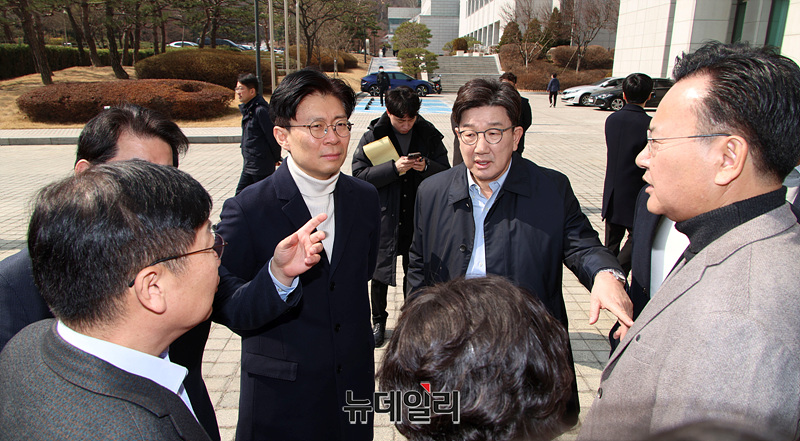 구속기소된 윤석열 대통령의 구속취소 청구가 인용된 다음날인 8일 오전 서울 서초구 대검찰청 앞에서 권영세 국민의힘 비상대책위원장과 권성동 원내대표를 비롯한 의원들이 대화를 나누고 있다.