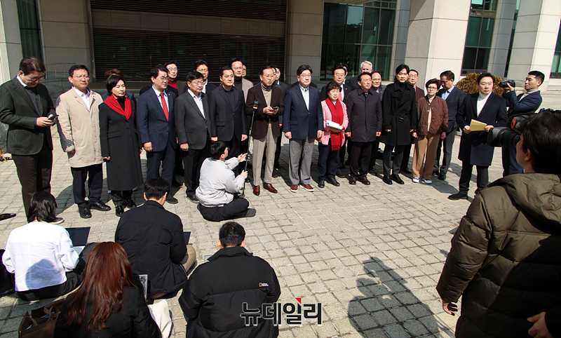 구속기소된 윤석열 대통령의 구속취소 청구가 인용된 다음날인 8일 오전 서울 서초구 대검찰청 앞에서 열린 국민의힘 비상의원총회에서 권영세 비상대책위원장이 발언하고 있다.