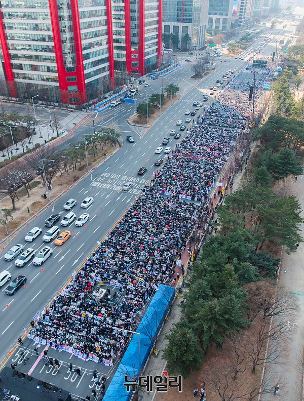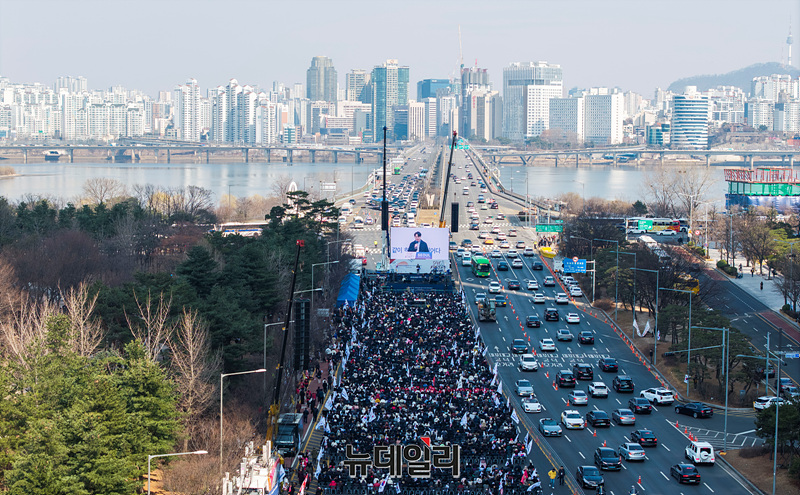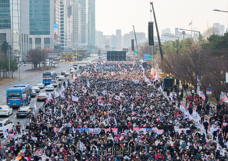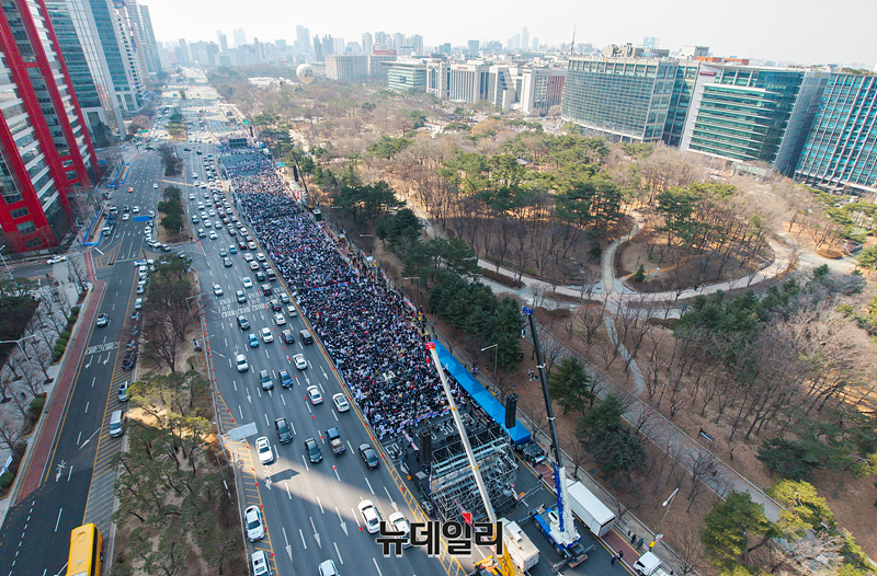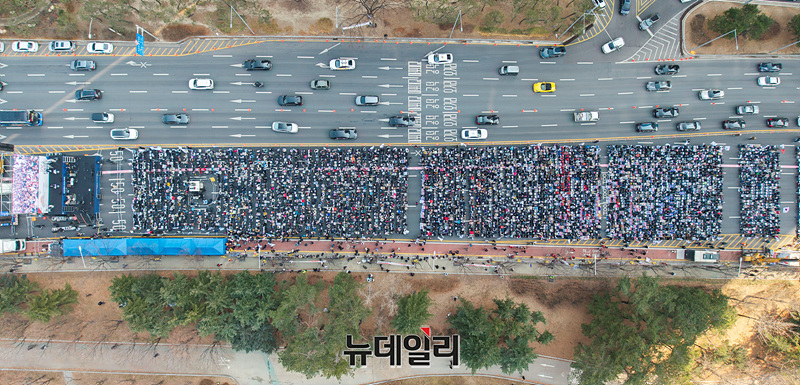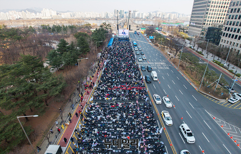 구속기소된 윤석열 대통령의 구속취소 청구가 인용된 다음날인 8일 오후 서울 여의도 여의대로에서 윤 대통령 탄핵을 반대하는 세이브코리아 국가비상기도회가 진행되고 있다.