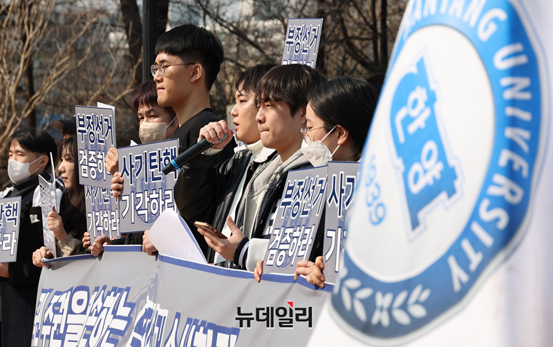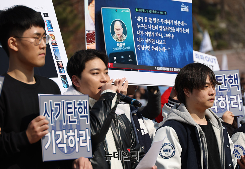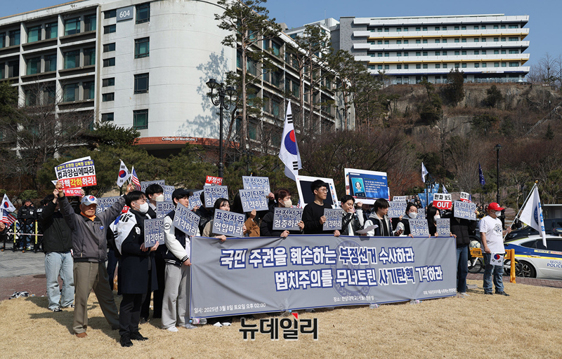 자유민주주의를 수호하는 한양대인이 8일 오후 서울 성동구 한양대 정문에서 윤석열 대통령 탄핵을 반대하는 시국선언을 하고 있다.