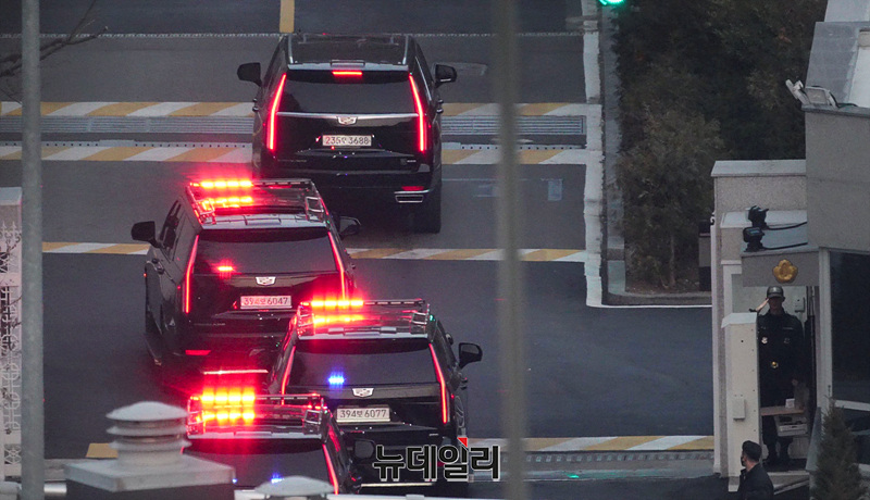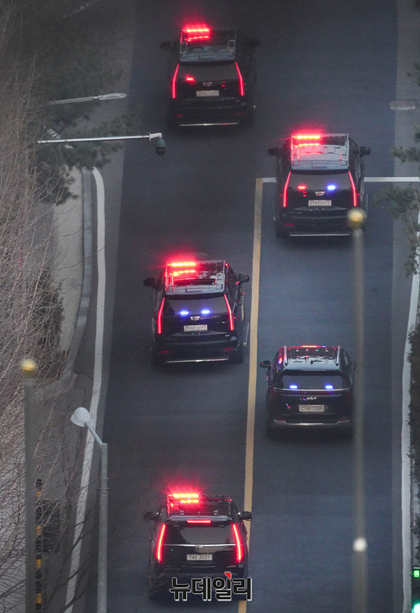 지난 1월 15일 윤석열 대통령이 체포된 지 52일만인 8일 오후 서울 용산구 대통령 관저로 윤 대통령이 탑승한 차량이 이동하고 있다.