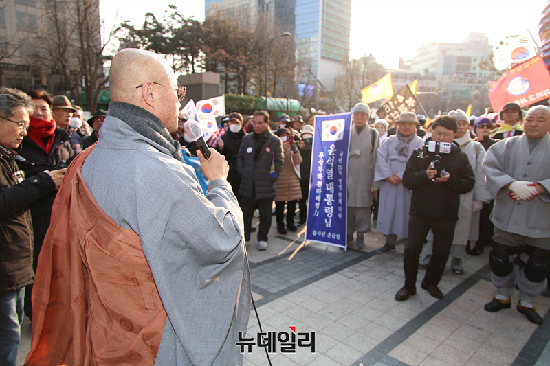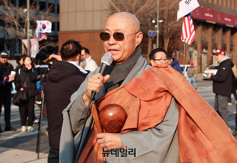 성호스님이 8일 오후 서울 청계광장에서 윤석열 대통령 탄핵반대 촉구 삼보일배에 앞서 발언하고 있다.