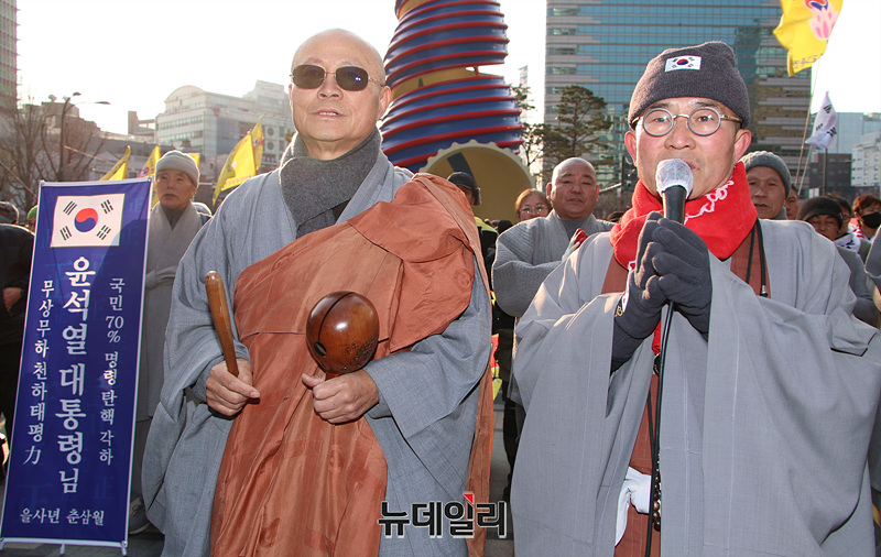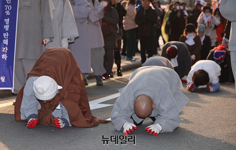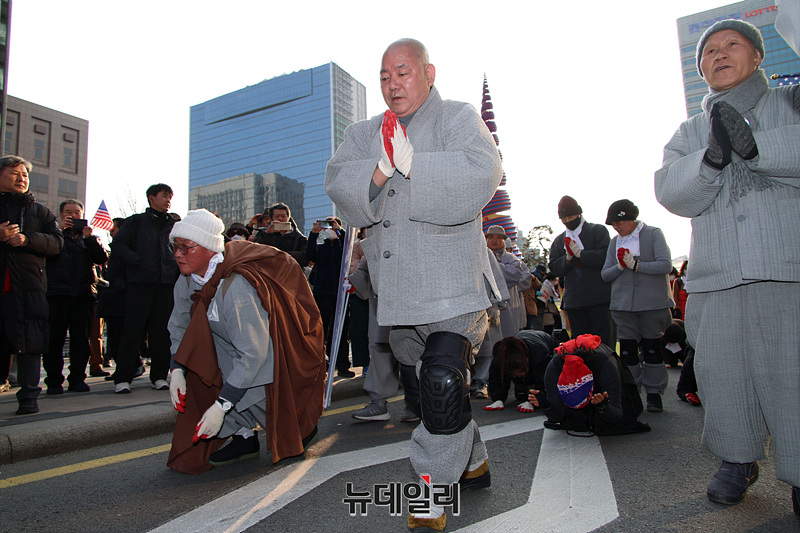 성호스님을 비롯한 불교계 스님들이 8일 오후 서울 청계광장에서 윤석열 대통령 탄핵반대를 촉구하며 헌법재판소 방향으로 삼보일배를 하고 있다.