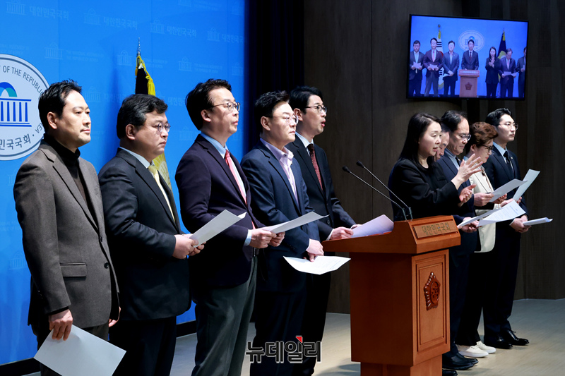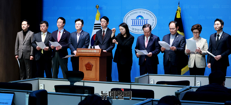 주진우 국민의힘 법률자문위원장 및 내람혐의 국정조사특별위원회 위원들이 10일 오전 국회 소통관에서 윤석열 대통령 불법체포·감금 등 혐의 오동운 고위공직자법죄수사처장 고발 기자회견을 하고 있다.