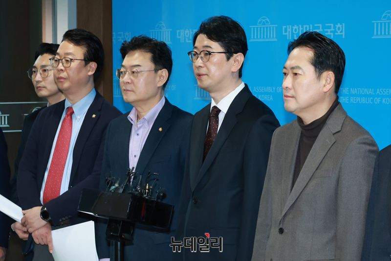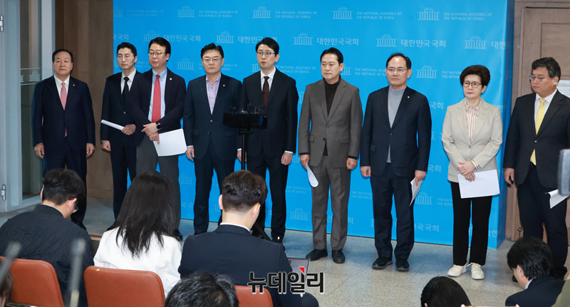주진우 국민의힘 법률자문위원장 및 내람혐의 국정조사특별위원회 위원들이 10일 오전 국회 소통관에서 윤석열 대통령 불법체포·감금 등 혐의 오동운 고위공직자법죄수사처장 고발 기자회견을 마치고 기자들의 질문에 답하고 있다.