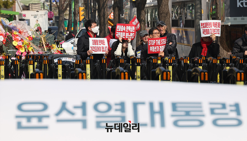 윤석열 대통령 지지자들이 10일 오전 서울 종로구 헌법재판소 앞에서 탄핵각하를 촉구하는 1인시위를 하고 있다. 이날 오전 대통령 탄핵에 반대하는 삭발식이 진행됐다. 우리공화당도 기자회견을 열고 탄핵기각을 촉구하는 기자회견을 진행했다.