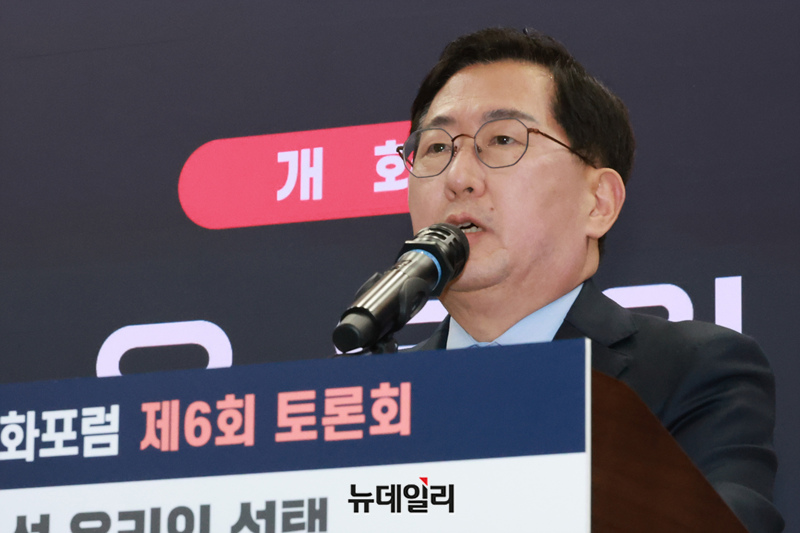 유용원 국민의힘 의원이 11일 국회 의원회관에서 '북핵 앞에 선 우리의 선택, 핵 잠재력 확보를 위한 한미 안보협력 전략'이란 주제로 열린 국회무궁화포럼 제6회 토론회에 인사말을 하고 있다.