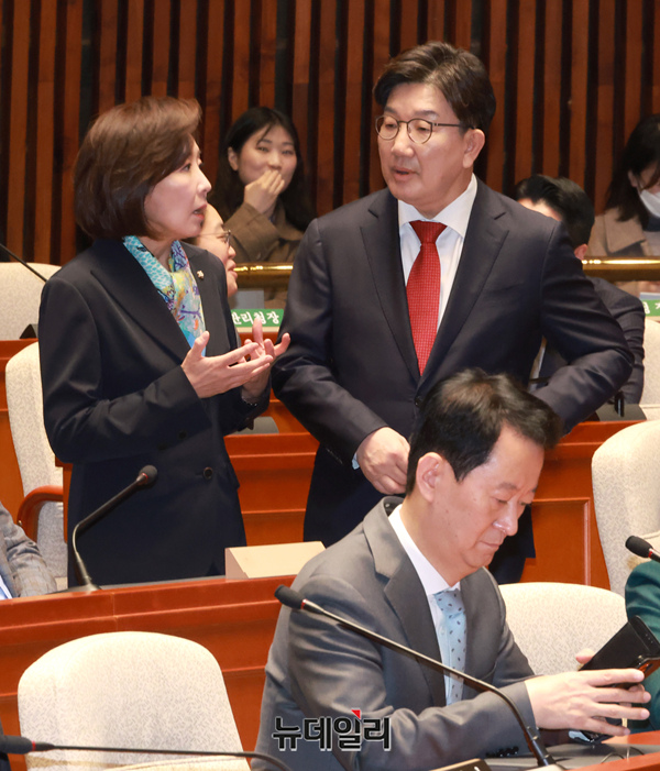 권성동 국민의힘 원내대표가 11일 국회에서 열린 의원총회에서 나경원 의원과 이야기를 나누고 있다.