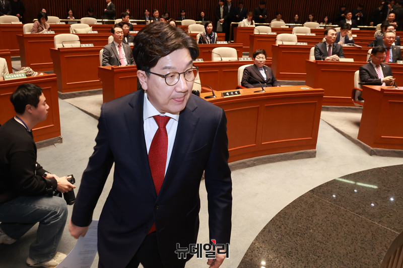 권성동 국민의힘 원내대표가 11일 국회에서 열린 의원총회에서 모두발언을 위해 단상으로 향하고 있다.